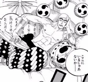 そのエネルが寝そべっている後方の屏風にはなぜかお経の様な漢字が記されていました。