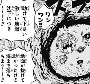 カイドウと空島が直接的に関係する描写であり、ここでキッドやホーキンス、アプーがいるアジトに落下しました。