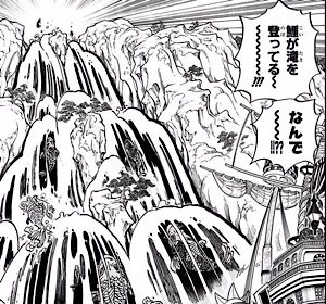 ルフィ達はワノ国への侵入に滝を昇る鯉に乗って到着しています。