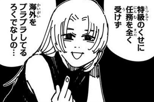 呪術廻戦0巻にて夏油に協力する形で五条悟の足止めを頼まれた呪術師の一人です。五条を止めるだけの力を有していると判断された実力者。五条本人も乙骨憂太が危険に晒される中、パンダと狗巻を飛ばして自分は「あの異人を片付けたらすぐ行く」と言っていました。相当な実力者であるからこその五条の言葉と解する事が出来ます。