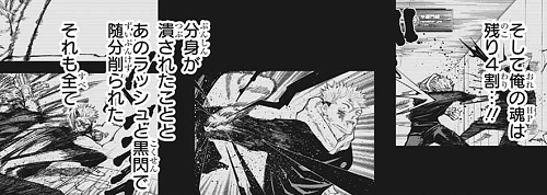真人は魂をHPと表現していました。現状虎杖は1割くらいで120%の覚醒手前で真人も4割と相当に削られていました。