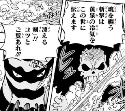 ブルックの剣技は黄泉の国の冷気によって斬られた部分が凍りつきます。