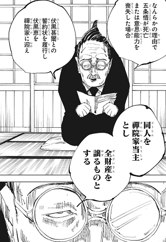 直毘人の遺言通りであれば「五条悟が死亡または意思能力を喪失した場合に伏黒恵が当主」だと明記されていました。