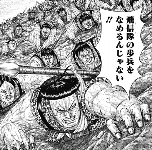 先の腕の太い歩兵団新兵も同じく、こうやって飛信隊に新しい芽が出始めているのを感じさせる描写と言えるでしょう。