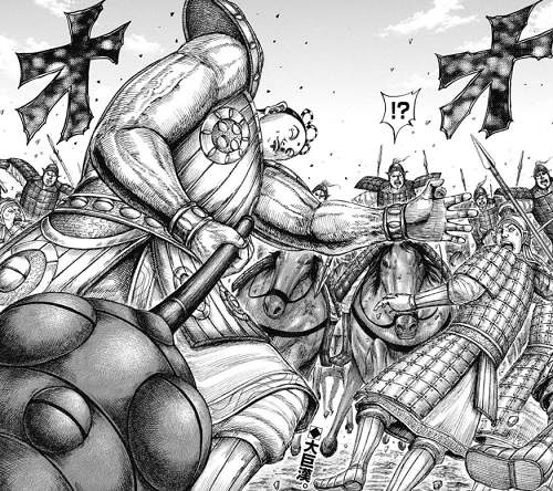 この通常と異なる棍棒は目の前にいた飛信隊の兵士を馬ごとボロ雑巾の様に蹴散らしました。