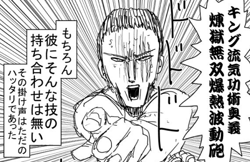 未完成のガロウの爆心解放拳に対して、バングが同じ技を持ってあたれば勝てる勝負の決め手になりそうなところ。