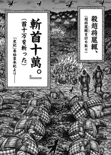 史実どおりの展開で桓騎は扈輒軍の捕虜全ての首を刎ねて殺し、焼いてしまいました。