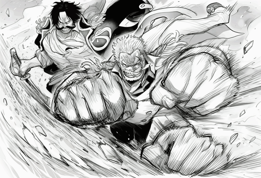 ロジャーは剣技に乗せ、ガープは強力な拳による連撃を繰り出しました。