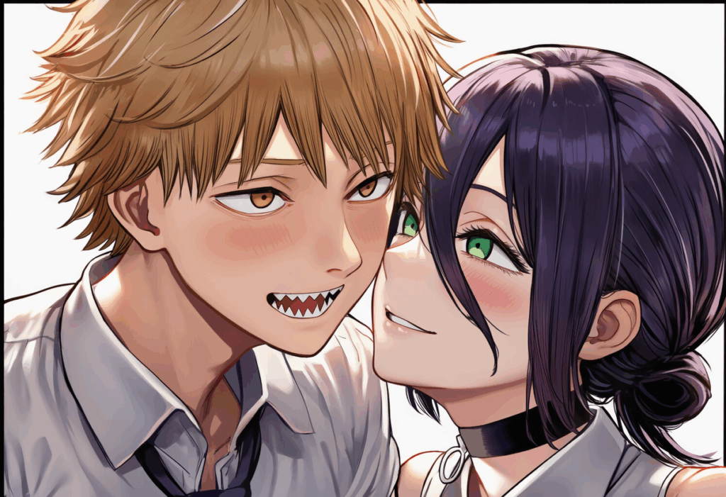 レゼとデンジのカップル2ショット・キス・上目遣い・谷間・水着【二次創作・同人】幸せな二人「もう一つの結末」